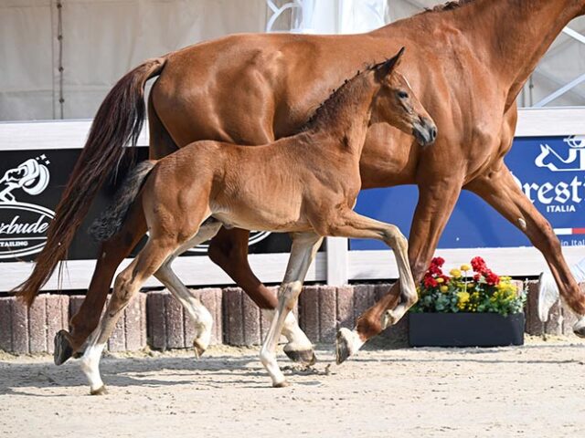 The collection included 48 foals from excellent dressage and showjumping sires from highly successful mare lines. A bay filly with outstanding movement quality from a first-class line rose to the top of the price list: Fürstin Vitalia, the apt auction name for the young horse, is a daughter of Fürst Zonik PS, the licensing winner and now successful in the large arena, out of a mare by Vitalis who won young horse tests. Her dam has already produced five successful sport horses up to Grand Prix level. Breeder Karl Häring from Aulendorf in Baden-Württemberg was delighted with the hammer price of €26,000 with a DSP client from the Czech Republic becoming the new owner...