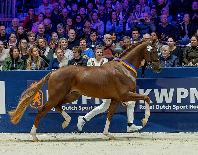 In the Knegt-powered championship round, four large-framed, modern sport stallions were presented alongside their breeders and registered owners. Schnaps (Mattias - Dolaris ster IBOP-spr prest x Cantos), bred by Hans de Roover and owned by Reinie Tewis and HBC Stal, proved to be the most complete stallion in Den Bosch. “We have selected four stallions that impressed us with their conformation, pedigree, and jumping performances,” said Wout-Jan van der Schans, chairman of the stallion selection committee. “The champion is a very modern showjumper. His sire is making an impact under Jur Vrieling, and this youthful, blood-type stallion has shown consistency in both of his rounds. He jumps with great technique, light-footedness, and excellent vision.”